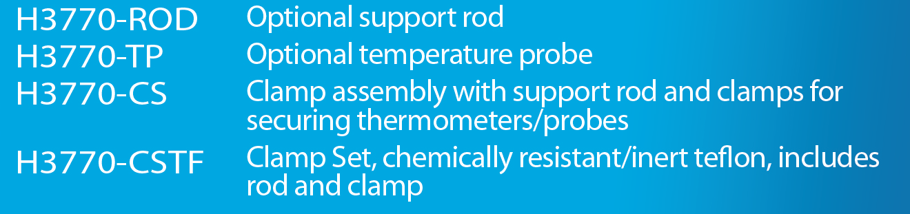 - Nhiệt độ và tốc độ trộn có thể được xem trên màn hình kỹ thuật số lớn và đèn LED an toàn sẽ sáng khi nhiệt độ đĩa trên cùng vượt quá 50 ° C. Một đầu dò nhiệt độ bên ngoài cũng có thể được sử dụng cho các ứng dụng yêu cầu kiểm soát chính xác nhiệt độ mẫu. Đầu dò cung cấp phản hồi trực tiếp đến bộ vi xử lý với sự giám sát và điều chỉnh liên tục để duy trì nhiệt độ đã chọn cho mẫu trong phạm vi +/- 1 ° C. Tất cả các mẫu đều tương thích với cốc thủy tinh borosilicat và các bình khác có dung tích lên đến 20 lít (thể tích khuấy tối đa 15 L). Có sẵn một cụm kẹp tùy chọn (H3770-CS) để gắn nhiệt kế, đầu dò nhiệt độ, v.v.