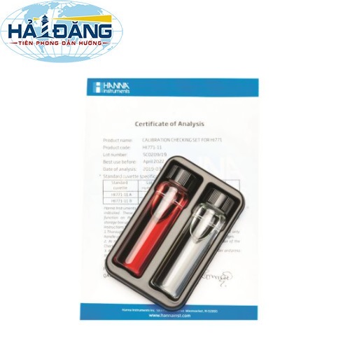 - HI771-11 là một bộ chuẩn chất lượng cao cho phép người dùng kiểm tra độ chính xác cho Checker Đo Clo Tổng Thang Cao HI771. HI771-11 bao gồm một cuvet trắng cho zero ppm clo tổng và một cuvet được nhuộm màu tương đương 200 +/- 10 ppm Clo tổng @ 25°C. Bộ chuẩn chất lượng cao được sản xuất tại nhà máy tiên tiến nhất của chúng tôi và sử dụng hóa chất trong một môi trường kiểm soát nhiệt độ.