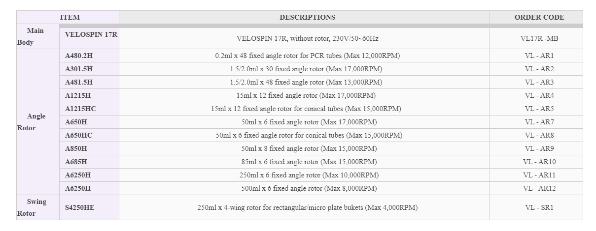 RPM tối đa: 17.000 vòng / phút (Rotor góc); 4.000 vòng / phút (Rotor văng)